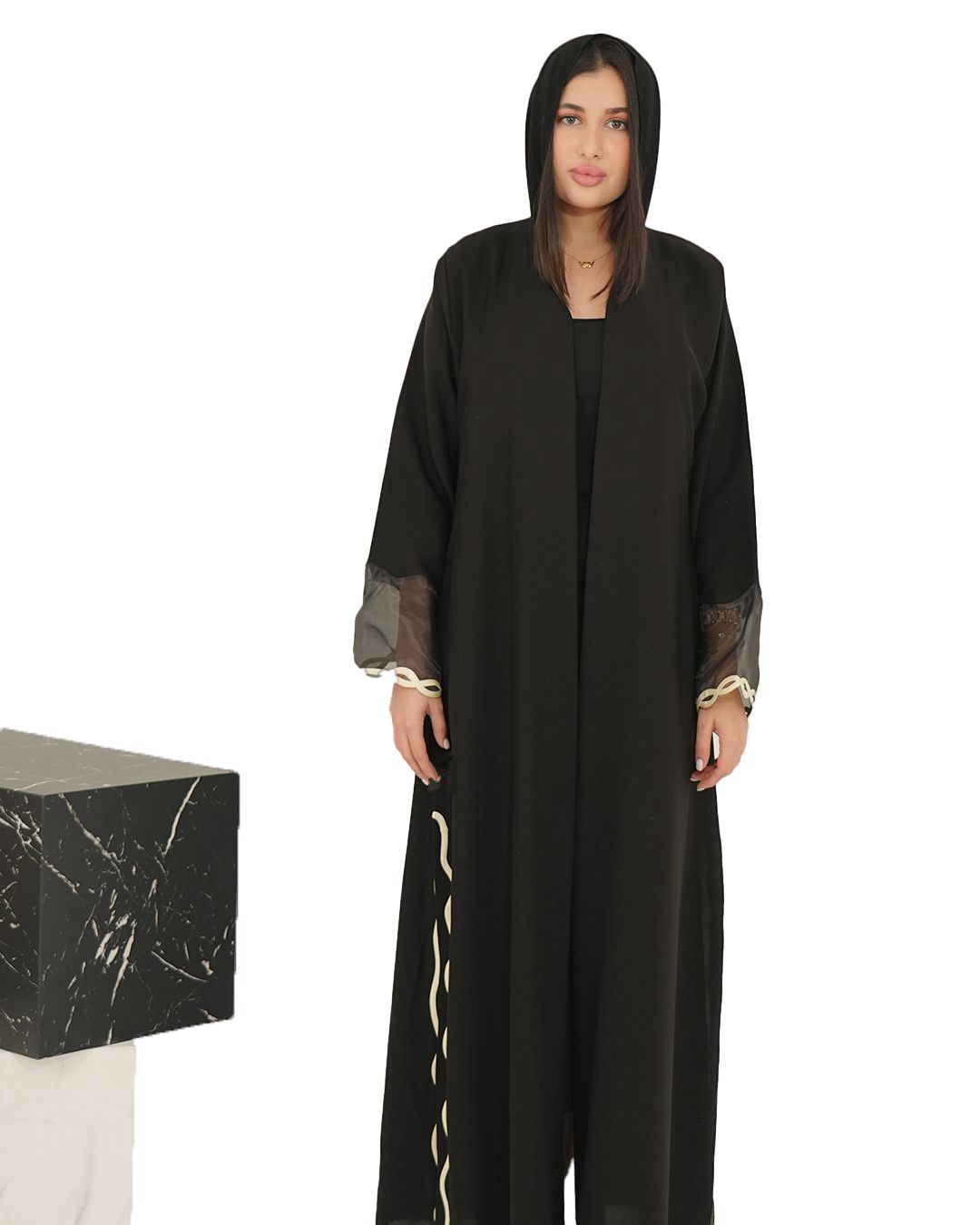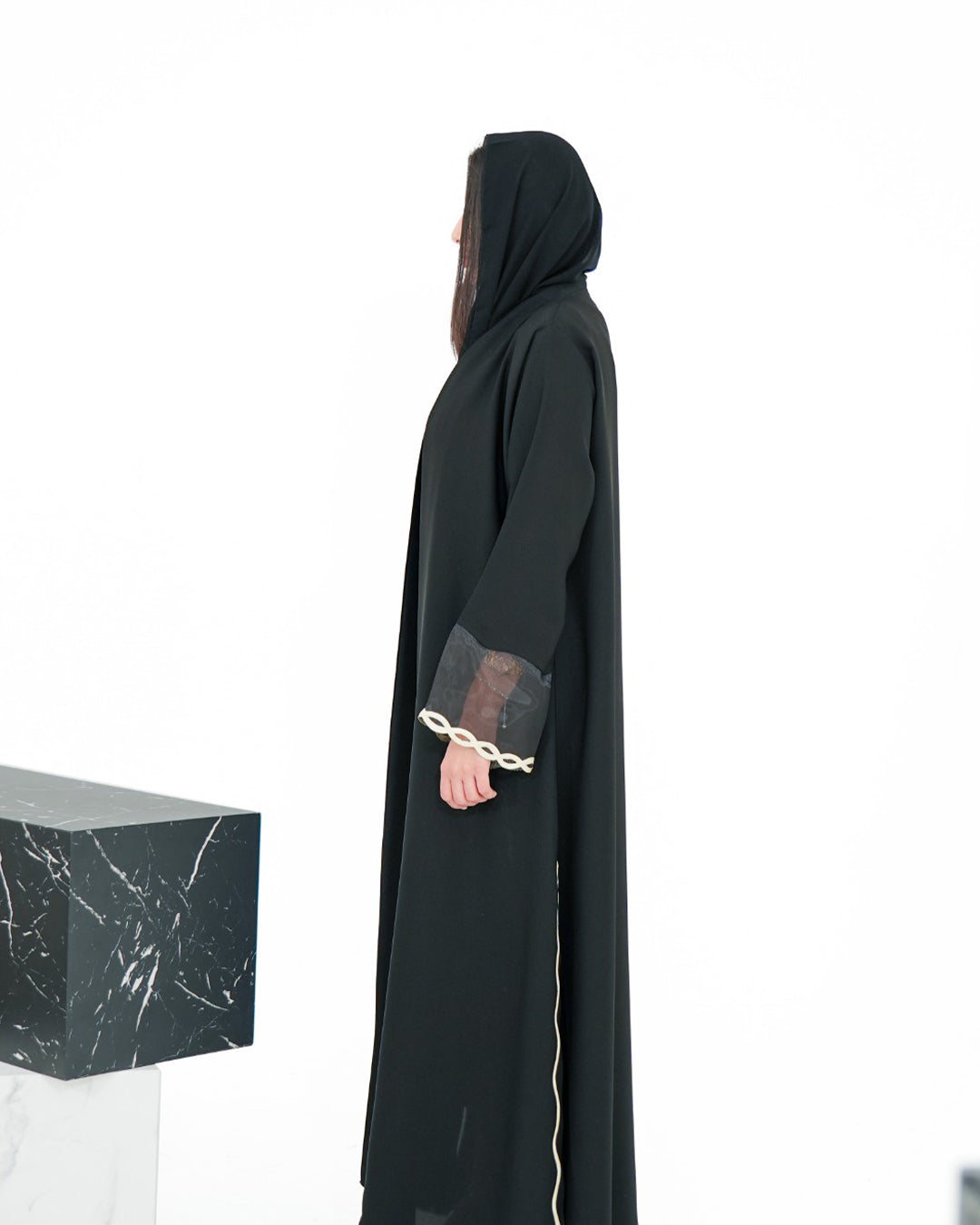 A premium black crepe abaya with organza handwork, lace on the sleeve edge, and a stylish side slit. Soft, light, and perfect for daily wear.