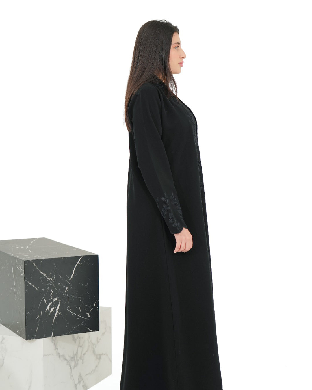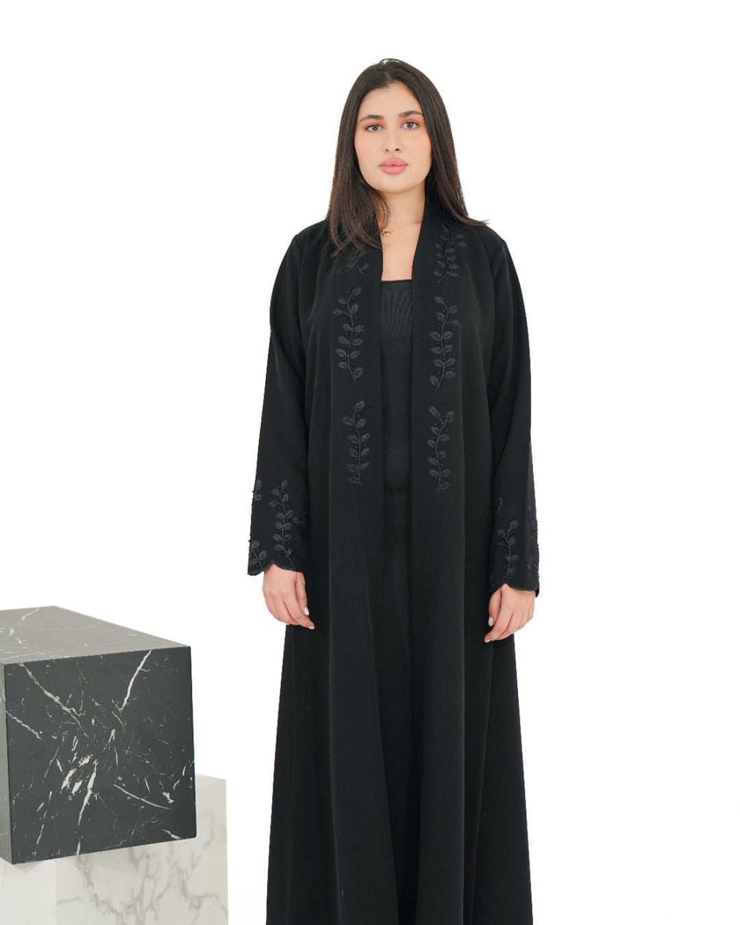 A beautifully crafted abaya with hand-embroidered sleeves and a unique neckline design. The scalloped sleeve detailing and hours of fine handwork make it a standout piece with a soft, elegant touch.