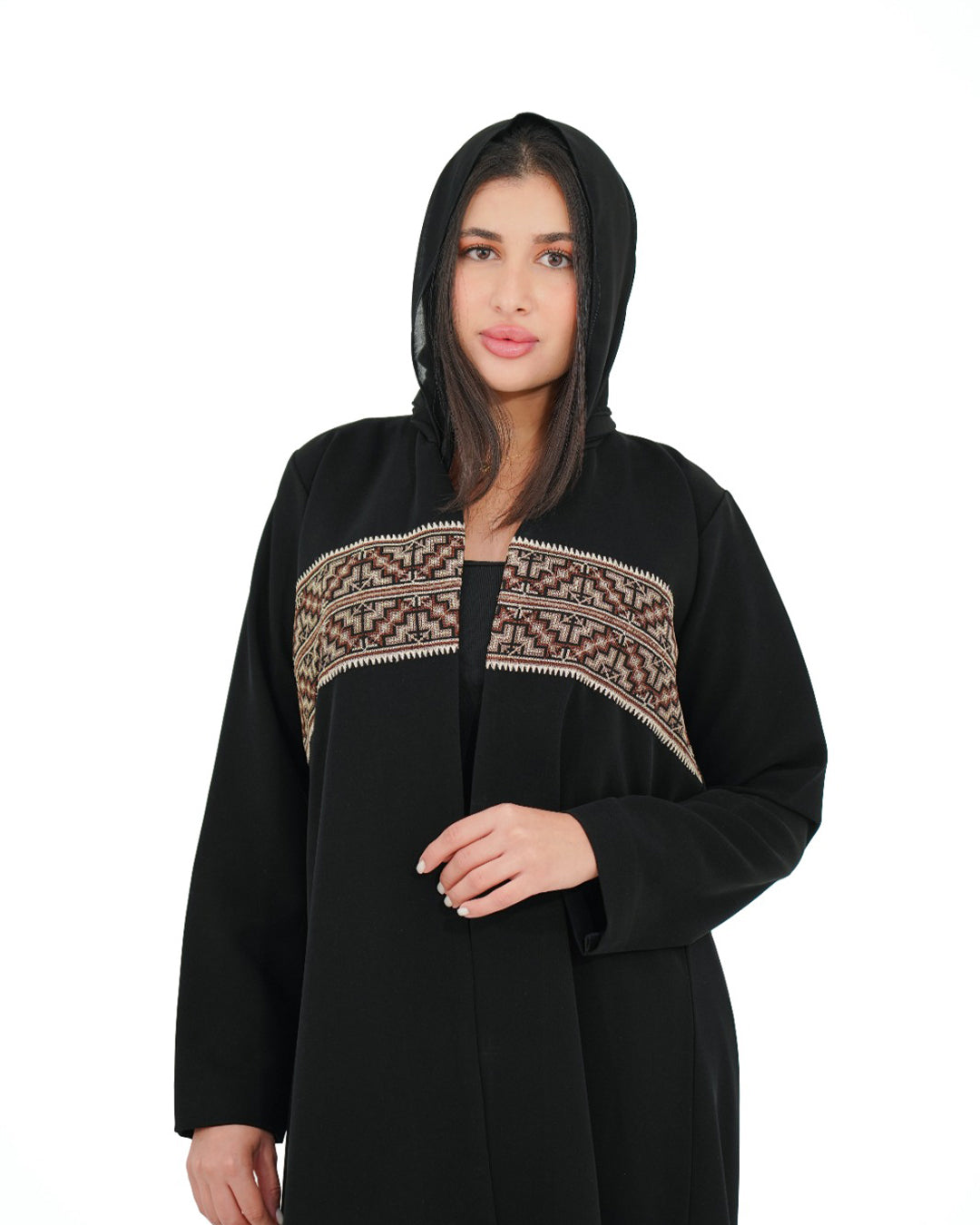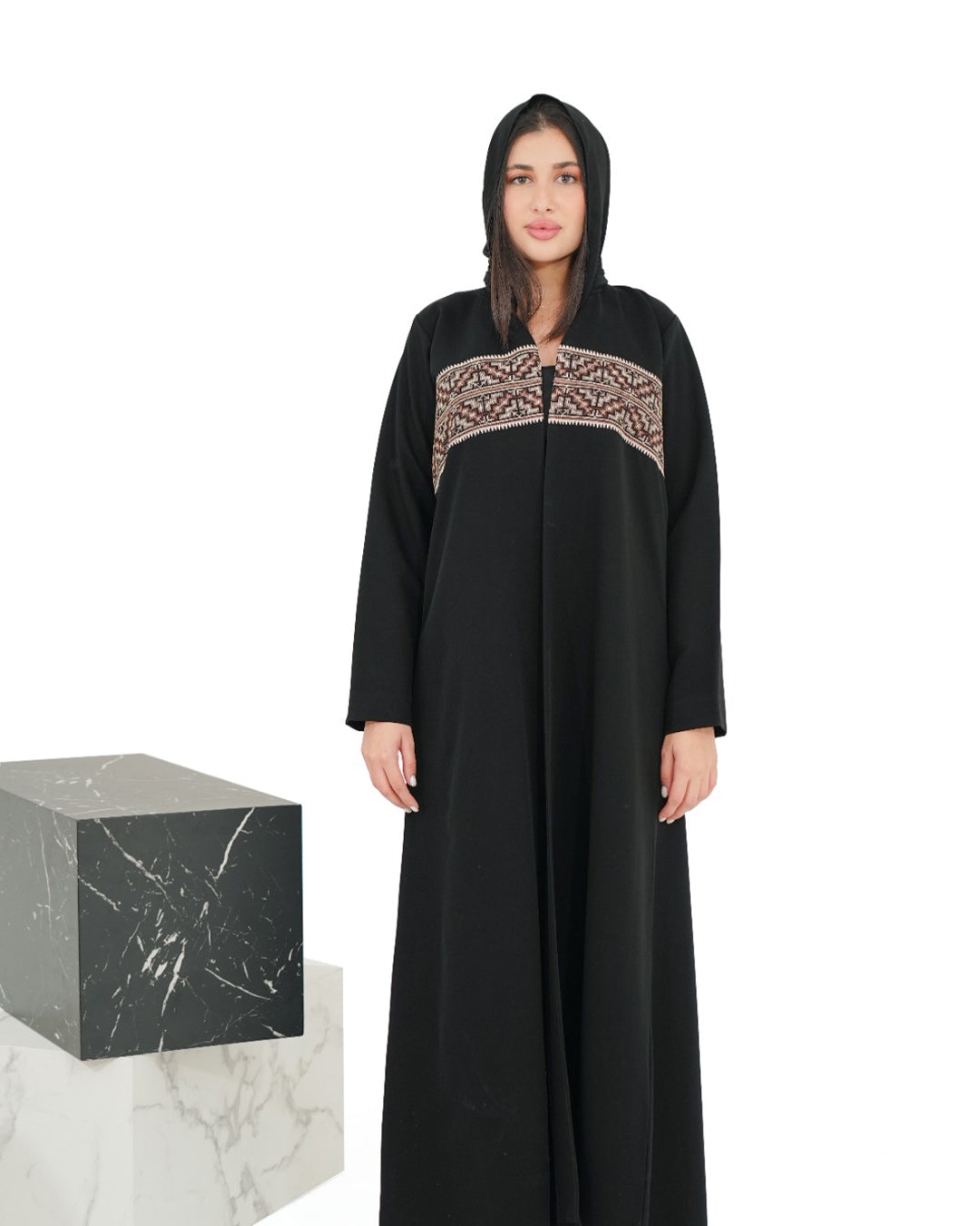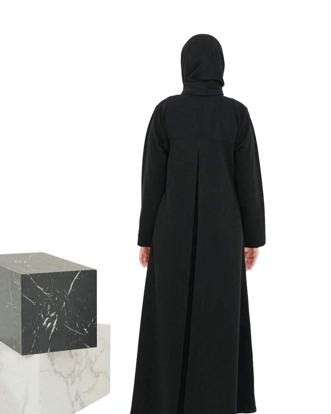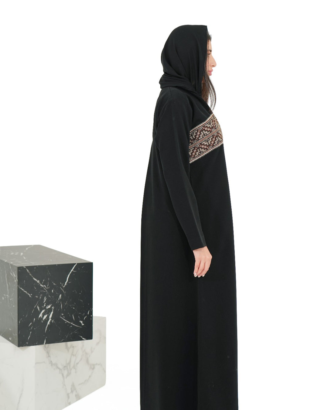 A modern black abaya with light hand-embroidered chest detailing, a clean plain finish, and a box cut on the back perfect for daily wear.